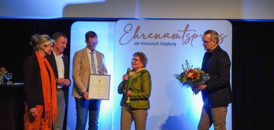 Foto (Majewski): Die Siegerin bei ihren Dankesworten mit Mikrofon auf der Bühne. Neben ihr (v.l.) Ute Krämer-Bönisch, Moderatorin und Leiterin des Bürgermeisterbüros, Vizebürgermeister Oliver Schmidt und KSI-Vertreter André Schröder, beide in der Ehrenamtspreisjury, sowie Stefan Rosemann.