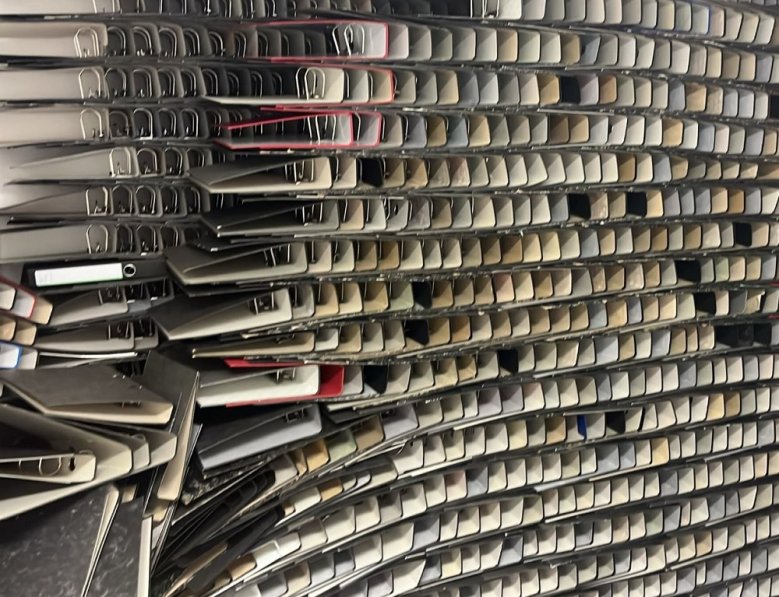 Was Sie im heute früh aufgenommenen Foto sehen, ist die Arbeit von sechs Monaten. Die Hüllen sind (noch) da, die Zettel schon weg. Wo wir bei den Ordnern sind: Die klassischen Verwahrprodukte aus dem Hause Leitz werden seit 2018 verwaltungsweit nur noch in absoluten Ausnahmefällen angeschafft. Sie treten den Weg ins sanierte Rathaus selbstverständlich nicht mehr an.