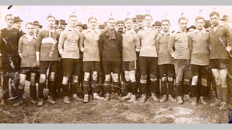 "Die 1. Mannschaft des Siegburger Sportvereins war mit 10 Mann, darunter reichlich Ersatz, nach Köln gefahren und unterlag hier der Rhenania mit 6:0. Eine solch hohe Niederlage hatte der Sportverein seit langem nicht mehr zu verzeichnen. Die 1. Mannschaft der Spielabteilung im Turnerkreis Siegburg-Stallberg gewann am Sonntag gegen die gleiche Mannschaft des Vereins für Spiel- und Sport, Deichhaus, mit 2:1." (Kreisblatt) Foto: SSV-Mannschaft im Jahr 1918 nach einem Heimsieg über Opladen. Das Bild stellte uns Margarte Kühnel zur Verfügung.