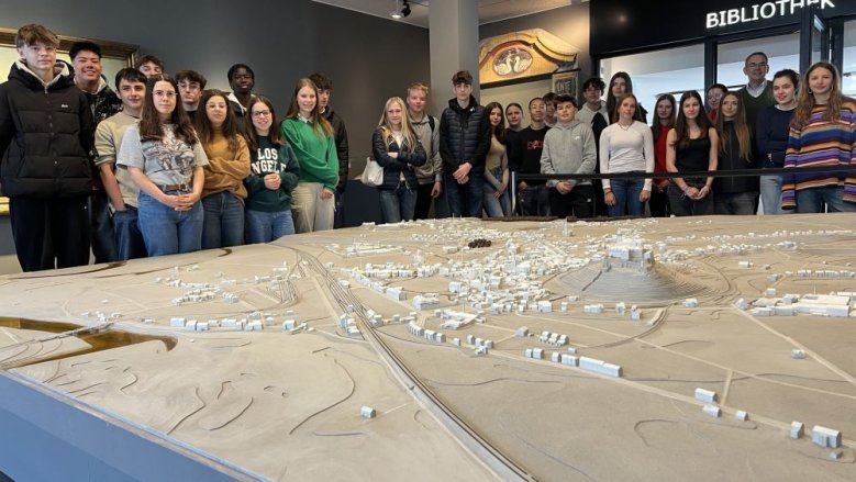 Seit Montag ist der Gegenbesuch da. Domführungen in Aachen und Köln stehen auf dem Programm, im Bonner Hofgarten wird gepicknickt. In Siegburg begibt man sich auf französische Spuren. Unser Foto zeigt den Empfang der gemischten Gruppe am Dienstag im Stadtmuseum. Dafür manövrierten wir die SuS, wie im Schulsprech die Schülerinnen und Schüler heißen, zum Stadtmodell, das Siegburg Anfang des 20. Jahrhunderts zeigt. Ins Auge fällt die Eisenbahn, die damals das Rückgrat in der Rüstungsinfrastruktur spielte. Munition ließ Siegburg wachsen. Zielrichtung der todbringenden Produktion? Frankreich. Heute sind die Gleise Siegburgs Anschluss an die Welt. Bürgermeister Stefan Rosemann erinnerte an den völkerverbinden Wert von Interrail. In Europa sei der Populismus auf dem Vormarsch, der zurückwolle zur nationalen Abschottung. "Dabei geht es um Öffnung, um Besuche bei denen, die wir nicht kennen, um zu erfahren, wie sie leben."