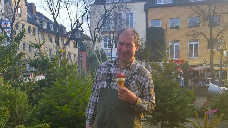 Zimt und Mandel? Das war gestern. 2015 dominieren in der Weihnachtszeit die Geschmacksrichtungen Erdbeer und Stracciatella. Ein Eis genehmigte sich am Samstag auf dem Markt der Weihnachtsbaumverkäufer Hubertus Steinhoff. Bei 16 Grad und einer Menge Arbeit eine angenehme Abkühlung! Wer jetzt über die viel zu hohen Temperaturen klagt, der sollte sich das Schicksal der New Yorker vor Augen halten. Dort werden am Donnerstag 22 Grad erwartet. Nicht Grad Fahrenheit, auch keine Minusgrade. 22 Grad Celsius! Foto: Melanie Duckwitz.
