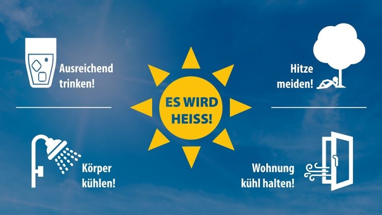 Es wird heiß! Der Deutsche Wetterdienst warnt für heute und morgen, Dienstag und Mittwoch, 1. und 2. Juli, vor einer extremen Wärmebelastung im Rhein-Sieg-Kreis. Wichtig jetzt: Ausreichend und regelmäßig trinken! Vor allem Wasser, Säfte oder Brühe sind eine gute Wahl. Verzichten Sie möglichst auf Koffein, Alkohol und Getränke mit viel Zucker, um den Körper nicht zusätzlich auszutrocknen. Meiden Sie die Hitze und halten sich an kühleren Orten auf! Sportliche Aktivitäten oder alltägliche Erledigungen sollten jetzt nach Möglichkeit in die Morgen- oder Abendstunden gelegt werden. Bewahren Sie einen kühlen Kopf! - ob mit einer kalten Dusche zu Hause oder einem Besuch im Freibad. Auch hilfreich: Kühles Wasser über die Handgelenke fließen lassen, eine kalte Kompresse auf die Stirn oder in den Nacken legen oder ein erfrischendes Fußbad unter dem Schreibtisch einrichten. Halten Sie Ihre Wohnung kühl! Lüften Sie in den Nacht- oder Morgenstunden und verschatten Sie die Fenster über den Tag, um die Räume möglichst wenig aufzuheizen. Und am wichtigsten: Achten Sie auf sich und andere!