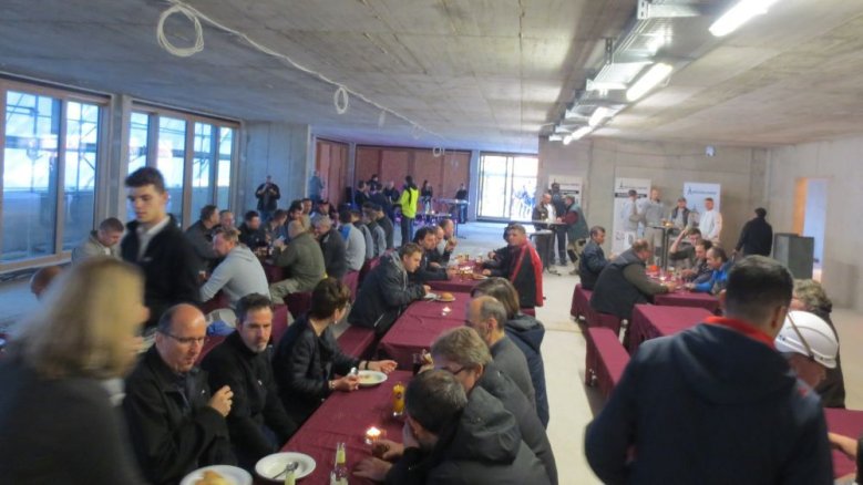 Noch einmal zum Richtfest. Das Erzbistum lud im Anbau ans kalte Buffet. Ein Dankeschön an all diejenigen, die am Gelingen des Großprojekts Michaelsberg beteiligt sind. Wo gestern die Bierzeltgarnituren standen, wird später die Verwaltung des Katholisch-Sozialen Instituts um den Chef Prof. Ralph Bergold sitzen.
